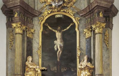 Der wohl anlässlich der Umgestaltung der Kirche 1769 entstandene Hochaltar stellt den Zielpunkt des Kirchenraumes dar. Das Marmorretabel ist über Opfergangportale, auf denen sich vergoldete Vasen erheben, mit den seitlichen Chorwänden verbunden. Die auf Konsolen zuseiten des Altarblattes stehenden Engelfiguren mit Weihrauchfass entstanden um 1769 und werden dem Bildhauer Philipp Jakob Straub zugeschrieben, dem Schöpfer der Fassadenskulpturen.